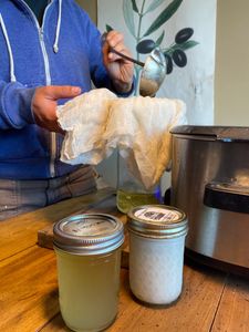 Strain through cheesecloth or another semi-porous piece of fabric to remove the impurities. Store in an airtight jar in the refrigerator or freezer for best quality and longest life.